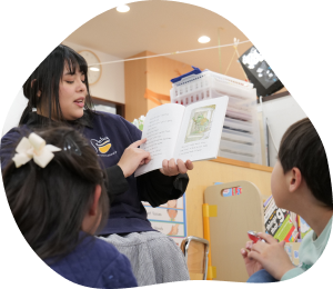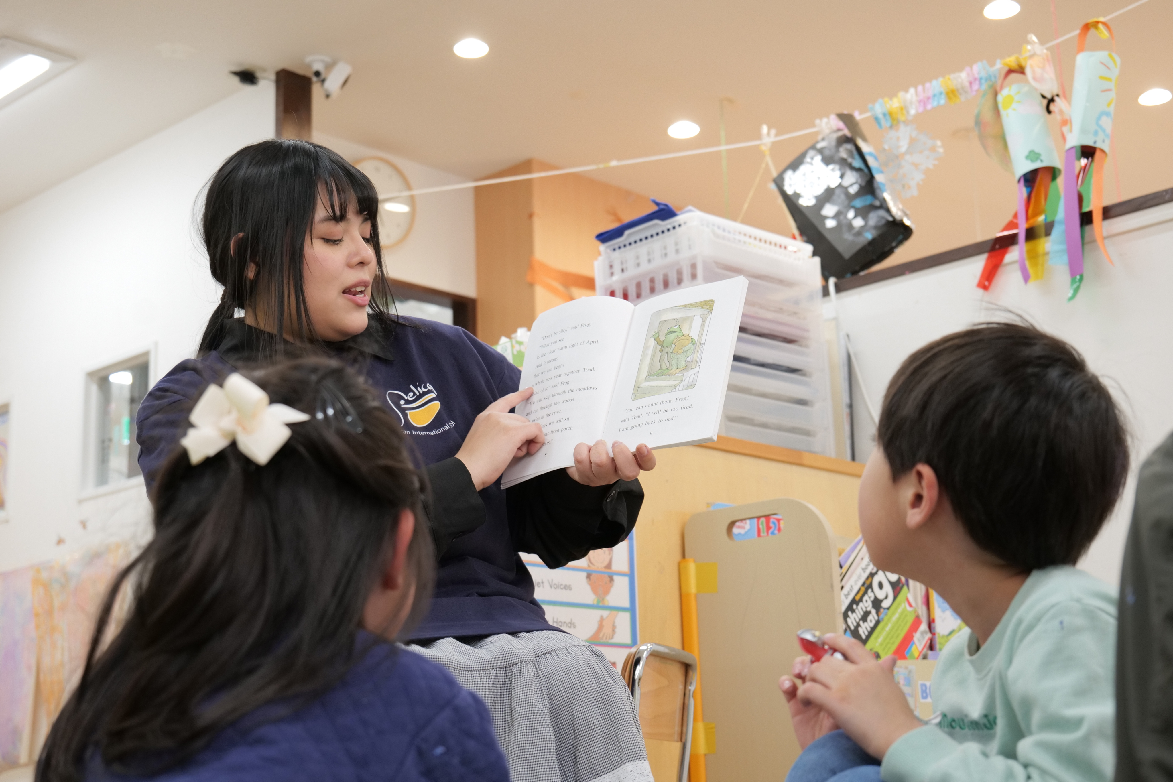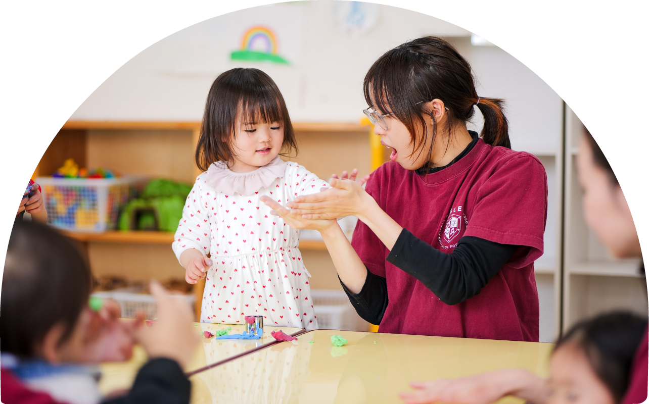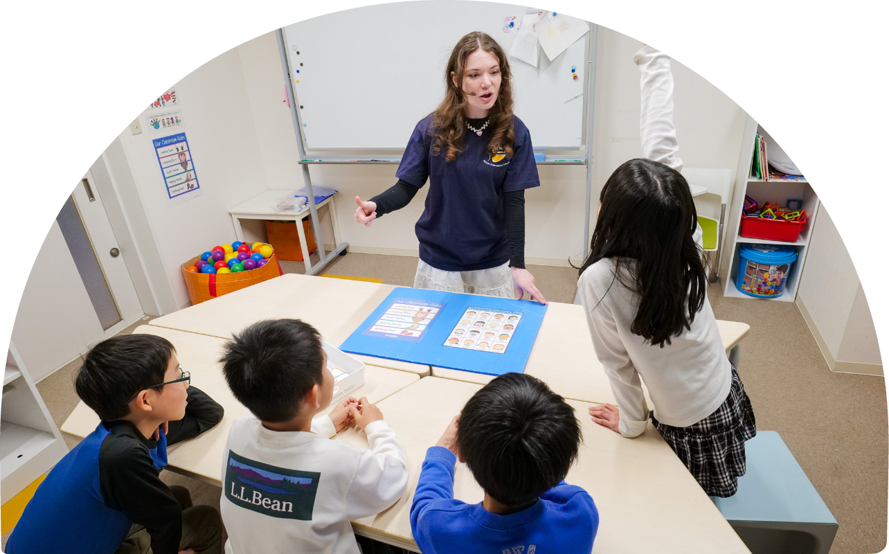 アメリカで広く使われている「クリエイティブ・カリキュラム」を基にしたプログラムを英語環境で学びます。子どもの発達段階に応じた多様なアクティビティを通じて、身体面、社会面、感情面、認識面をバランス良く育てます。これらのアクティビティは全て英語で行われ、自然な形で英語がインプットされることで英語の基礎力が養われます。特に2〜3歳児向けのコースでは、英語や外国人とのコミュニケーションに親しみを持ち、楽しんで続けられるようなプログラムを用意しています。