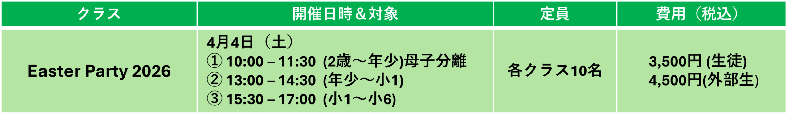 イースターはキリスト教においてはクリスマスと同じくらい重要なイベントです。 日本ではあまり親しまれておりませんが、一味変わった経験を楽しみにいらしてください。 ▼開催地 〒180-0013 東京都武蔵野市西久保2-19-7 ベルジュール武蔵野IV 1F ▼持ち物 飲み物(必要に応じてオムツ) ★申込方法 ①こちらのURLから、もしくは下記申込書にご記入の上、スクールにご提出ください。 申込み書: 2026 Easter Party flyer ※お申込み・入金後席確保となります。 参加費の返金は致しかねますので予めご了承ください。 (イベントに振替可能)